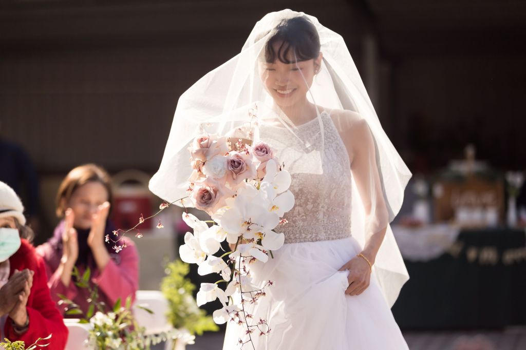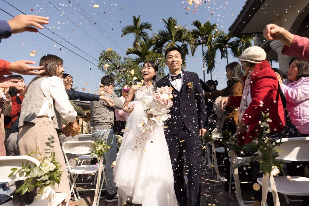 這個時刻,現場的親友們統統起身,為新人的這一段退場,撒下滿滿祝福的花瓣,都開心的笑著!