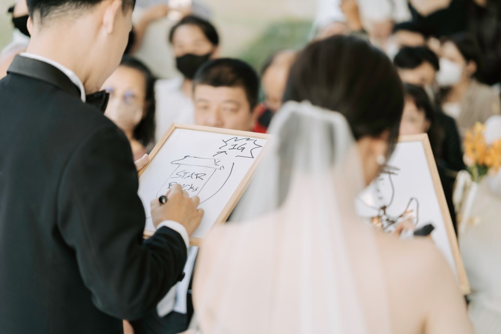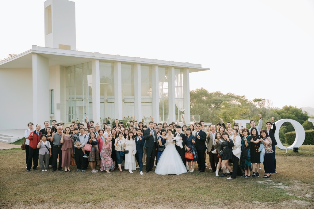 證婚儀式完成,發現外頭天還亮著,趕快趁著太陽公公下班前,大家一起來拍合照啊!縱使這樣的大合照,每個人的臉看起來都會是小小的,但能讓大家共同來完成大合照這件事,也是為此刻的我們、為婚禮都留下回憶與紀錄了!