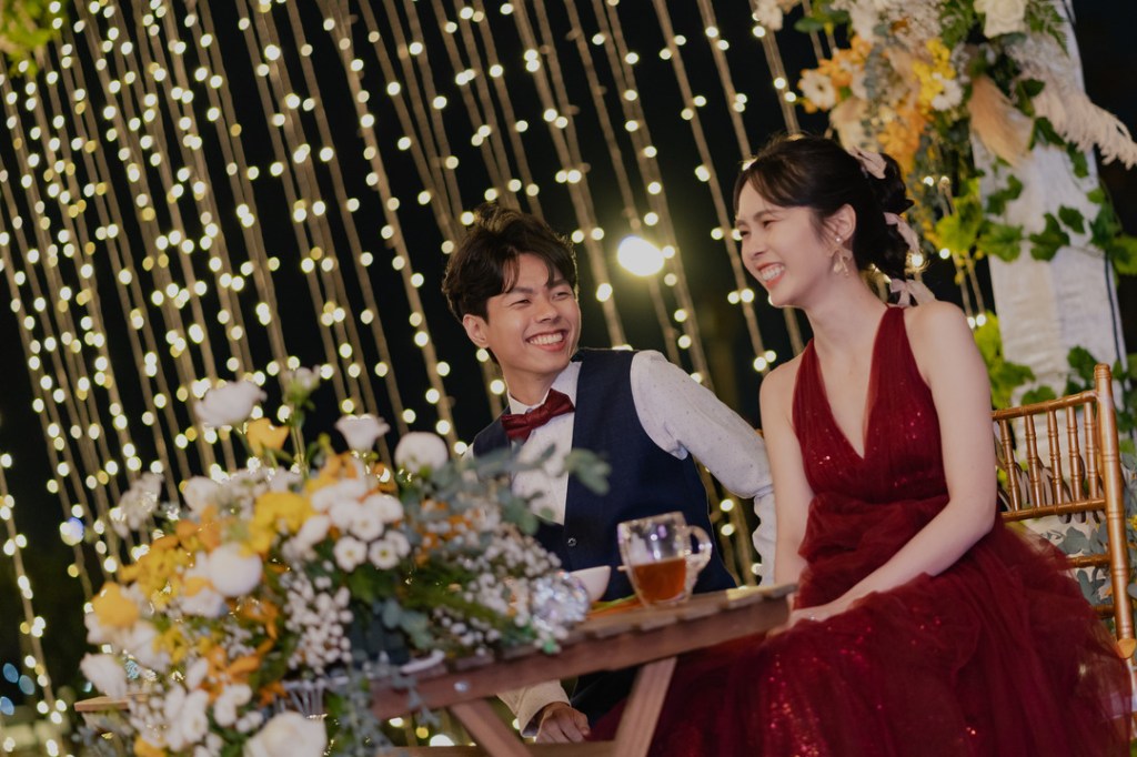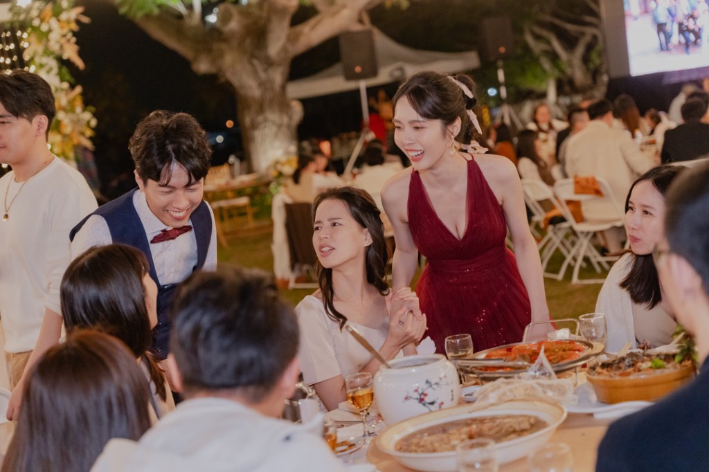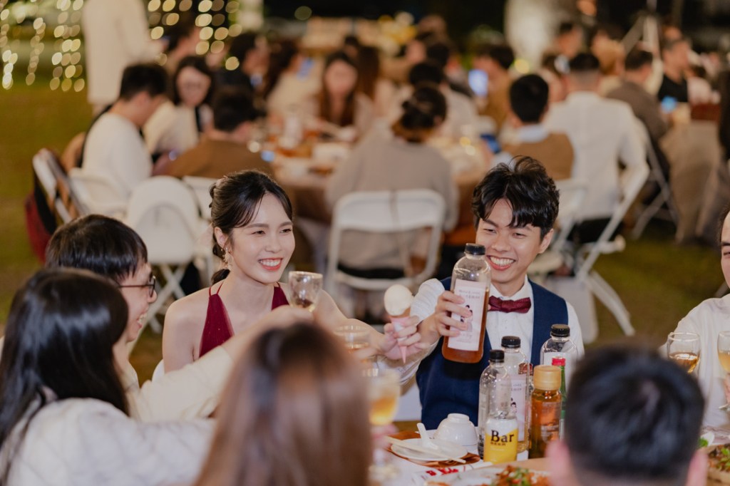 來到晚宴時刻,就是戶外婚禮才會有輕鬆自在感;大家在開放的空間場域歡聚,享受微風徐徐吹來,身邊有好友陪伴,桌上有辦桌美食,還有好聽的音樂,大喊一聲:「這才是人生啊!」